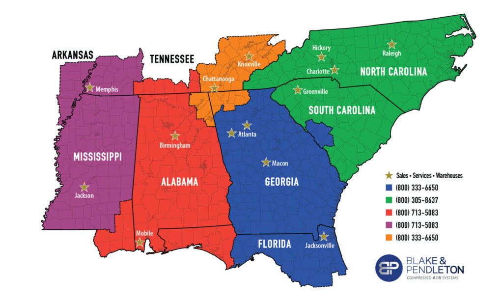 Our Macon facility has over 90,000-sq.ft., which contains the corporate offices, central warehouse, compressor and pump assembly and repair shop. We also rebuild rotary screw compressor airends of all brands and have full machining capabilities. We have the capability to test compressor and pump packages up to 250HP.When a customer has an emergency requirement we have rental fleet of compressors from 10HP – 300HP and rental air dryers for 100SCFM to 5000SCFM.