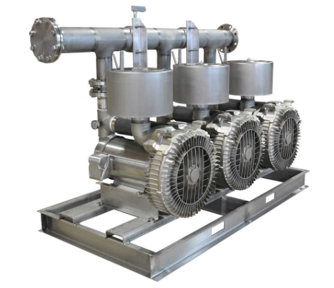 This blower offers vacuum or pressure configurations. A PC based control center simplifies operation.This system featured mechanical seals. Special coatings available include electro-less nickel and Teflon. The magnetic drives were selected to enhance leak tightness between the motor and pump housing. Specialized instrumentation, an explosion proof motor, and high temperature bearings round out the features.